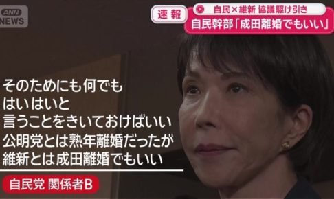 維新・吉村の交換条件「衆院議員定数の削減」の衝撃 サナエ「(総理に)絶対なってやると思っている」 半分極道のサナエが主役になることで、だんだん、首班指名が極道の跡目争いみたいになってきた。 サ…