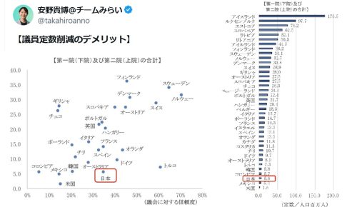 安野貴博・チームみらい代表 「定数削減のデメリット」 安野貴博@チームみらい@takahiroanno 【議員定数削減のデメリット】 国会の議員定数削減の議論が盛り上がっています。 衆議院の議員定数を1割(…