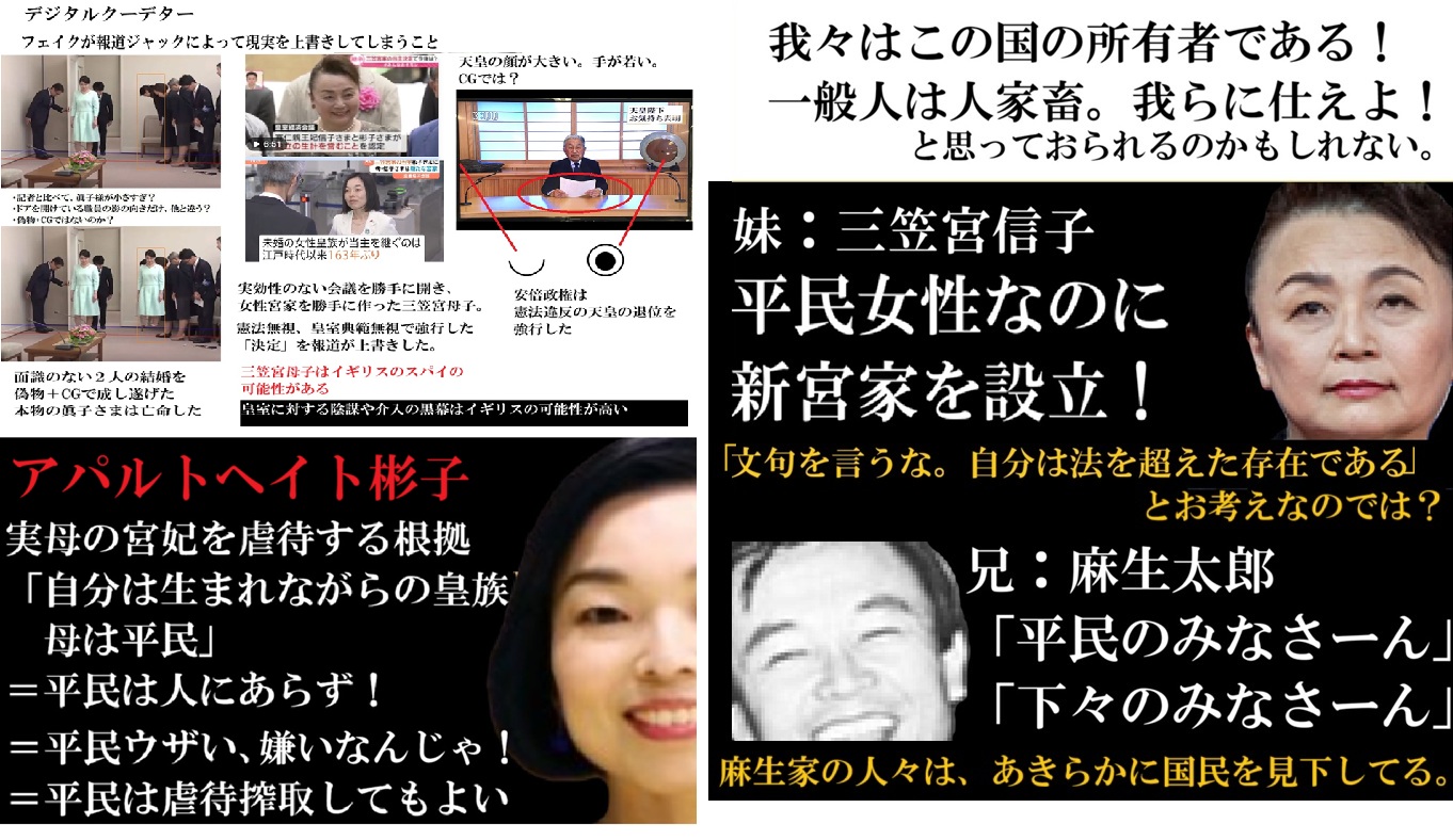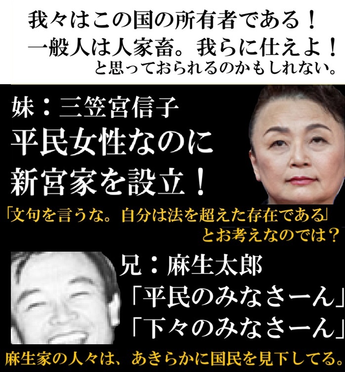 「三笠宮信子さまは皇室典範に従い宮家を相続されたのに、彬子さんが簒奪し、信子さまは新しく女性宮家を設立した。もう無茶苦茶。あの母子は法を踏みにじり、国民を蔑視して軽んじ、やりたい放題。どちらも廃宮にするべきです」