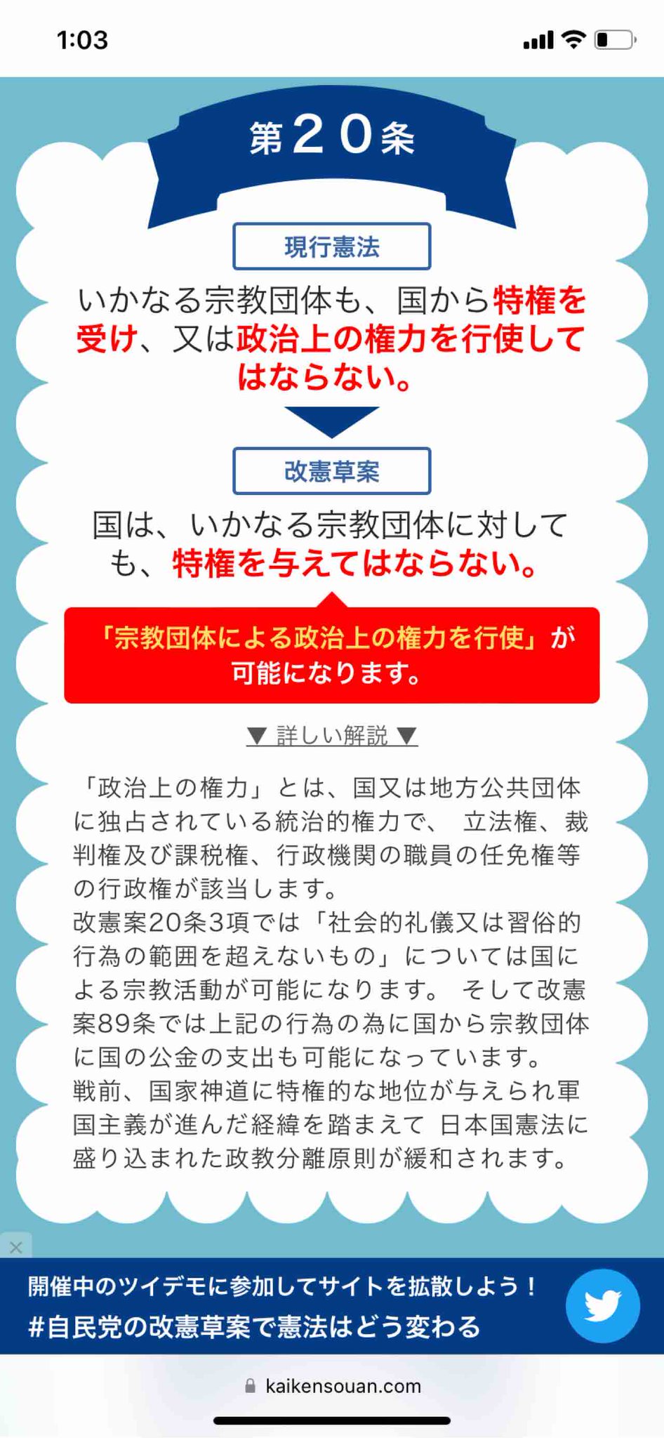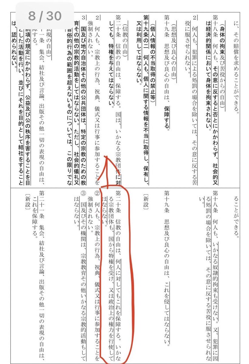 9条が注目されがちだけど第20条で、現行憲法から宗教勢力の政治介入を禁止する項目をしれっと削除してる。