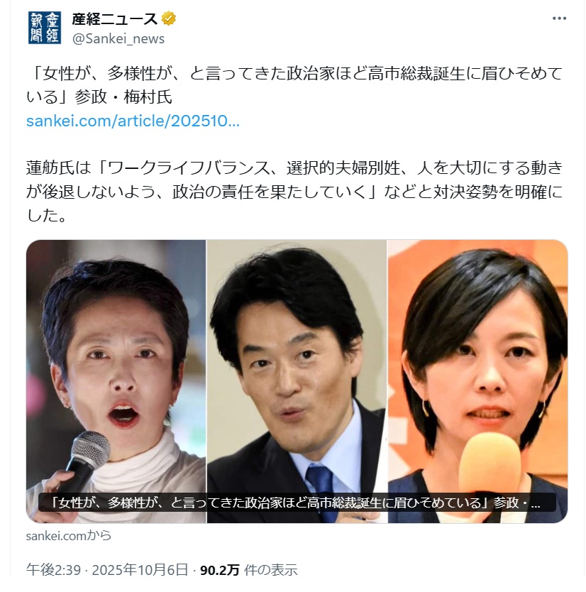 参政・梅村氏「女性が、多様性が、と言ってきた政治家ほど高市総裁誕生に眉ひそめている」