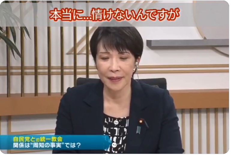 サナエ「統一教会、イコール、世界平和過程連合ですか、であるとか、イコール勝共連合であることは、本当に情けないんですが、今年お8月になって報道が様々なされるまで、わかりませんでした」