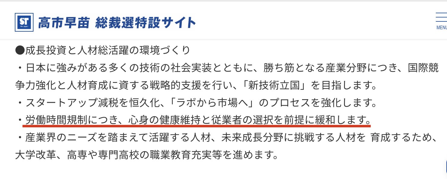 高市氏のワークライフバランス捨てる発言は、ある程度は意図的に行ったものと見ていいかもしれない。高市氏の総裁選公約には、労働時間規制の緩和が明記されているので、何の意図もなく「ワークライフバランスを捨てる」なんて言葉を選択することはないだろう。