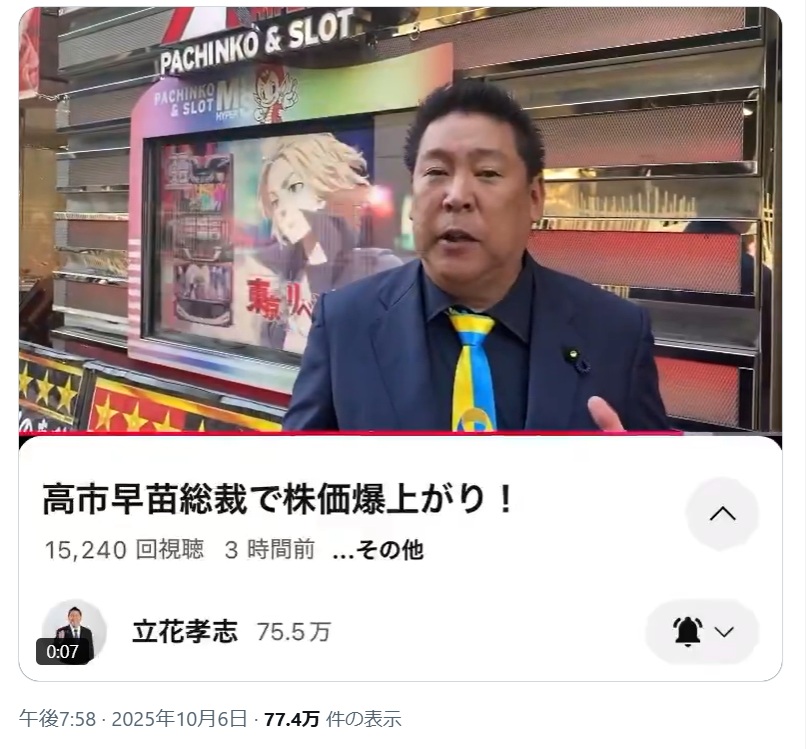 立花〝解散総選挙になったら高市早苗さんを応援するための選挙に出るつもりです〟