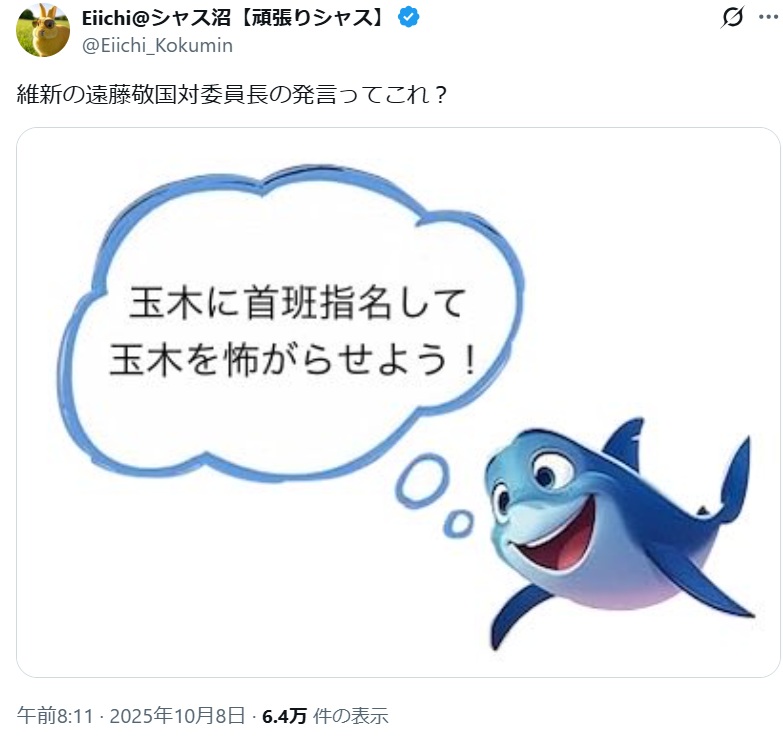 10/9 共同通信【速報】玉木氏、首相指名で自身への一本化に否定的