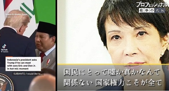 一番勢いのある組織の一番エライおっさんを、飛び石のようにぴょんぴょん飛び移りながら、極左から極右へ移動してきた「輝く女性」、それがサナエ。奈良の地元の選挙民から「あんた、永田町の公衆便所と言われてる層やな」と言われたそうな。サナエの議員歴の内容がどのようなものだったかががわかる気がする。