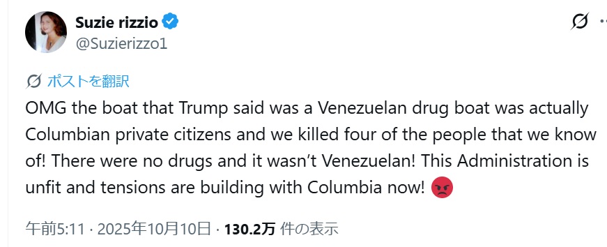 「トランプがベネズエラの麻薬ボートだと主張した船は、実はコロンビアの民間人のもので、知られている限り4人を殺してしまった!麻薬はなく、ベネズエラのものではなかった!この政権は不適切で、コロンビアとの緊張が高まっている!」