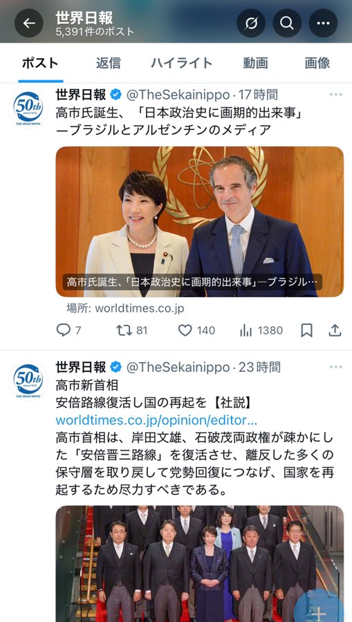 世界日報さんが連日、高市早苗祭りしてますね。余程嬉しいのね