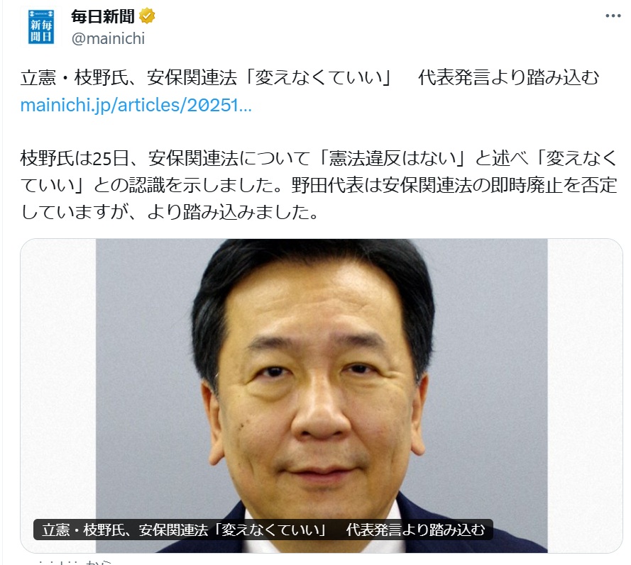 枝野さんや野田さんがリードする立憲民主党は、自民党の補完勢力に過ぎないことが良くわかりますね。このままでは、高市・維新の軍国主義路線を立憲がさらに加速させる役割を果たしそうです。自民の解党と同じくらい立憲民主の解党が必要だと感じます。
