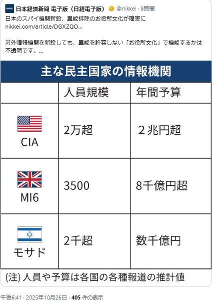 日経が「諜報機関を作っても大丈夫ですよ。大したことないですよ」と言い出した。