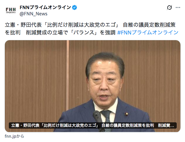 立憲民主党は党首替えたらどうかね?少なくても立憲民主の今の議員や末端の党員は、議員定数削減なんて言ってないだろ?国政選挙の時に出している「政策集」にも殆ど触れられていないだろ?この調子だと「バランス」取れたら賛同する気まんまんじゃないか。