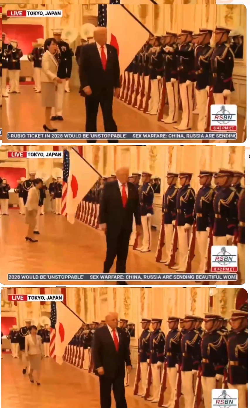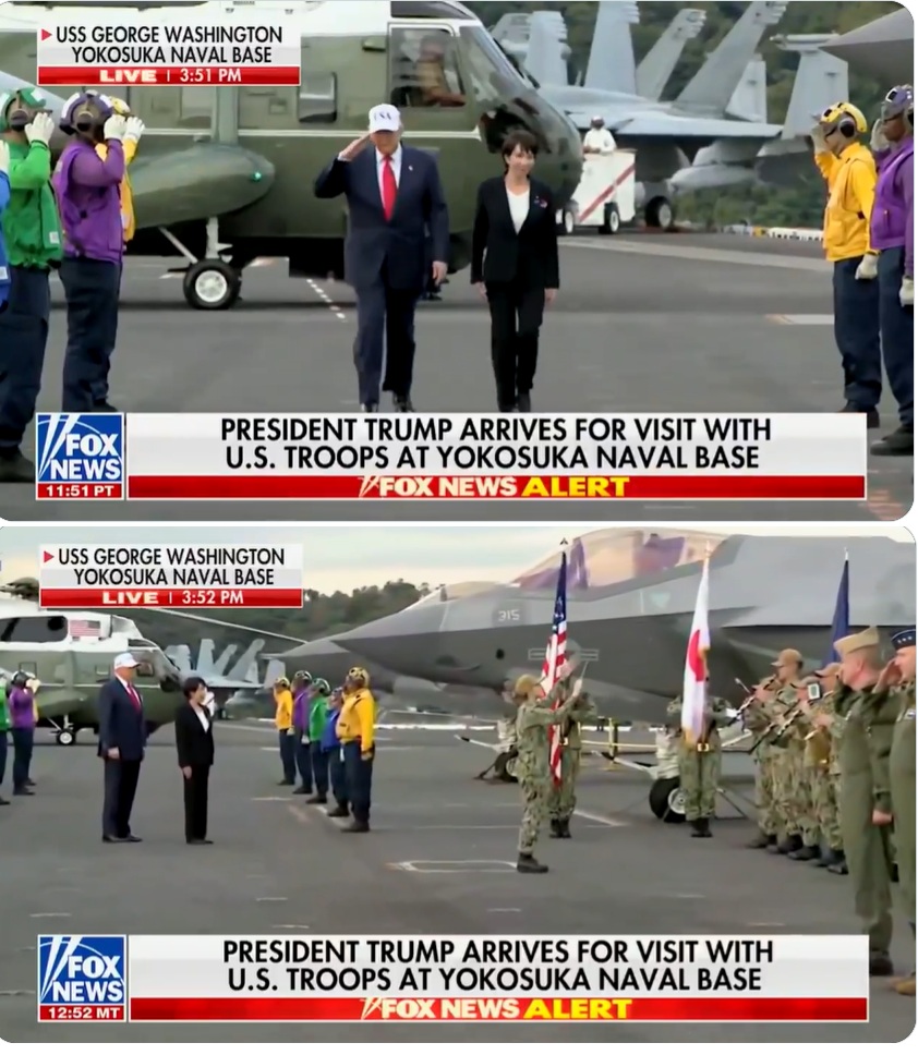 .@POTUS is greeted by a cordon of U.S. Navy Rainbow Boys as he and Prime Minister Takaichi arrive on the USS George Washington at Yokosuka Naval Base pic.twitter.com/O6Z6IJQwxu