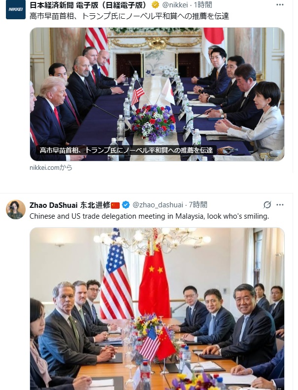 (共同通信)高市総理、トランプ大統領をノーベル平和賞に推薦へ