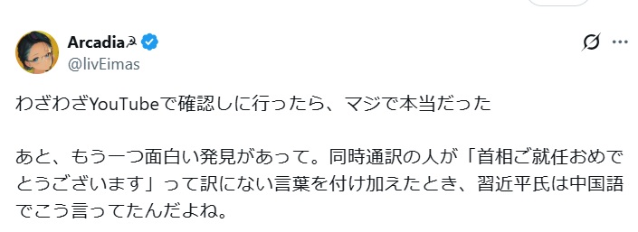 同時通訳の人が「首相ご就任おめでとうございます」って訳にない言葉を付け加えたとき、習近平氏は中国語でこう言ってたんだよね。
