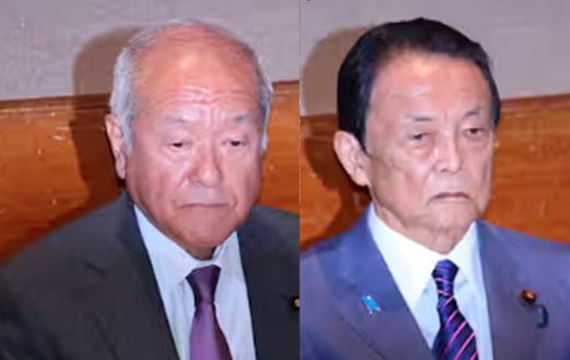 鈴木首相の息子の鈴木さんと、吉田茂首相の孫の麻生さん。麻生さんの奥さんが鈴木さんの妹という親戚関係。自分たちが天下を取ったはずなのに、表情が暗い。