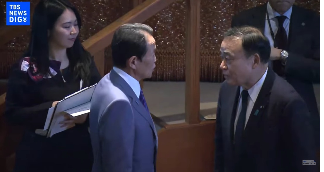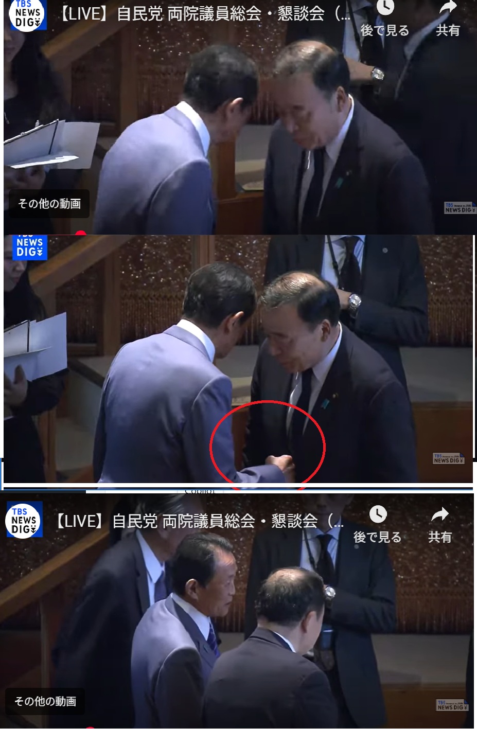 高市政権を作った麻生太郎が入場。麻生さんと話している議員は、たぶん、坂本 哲志さんか梶山さんのどっちか。
