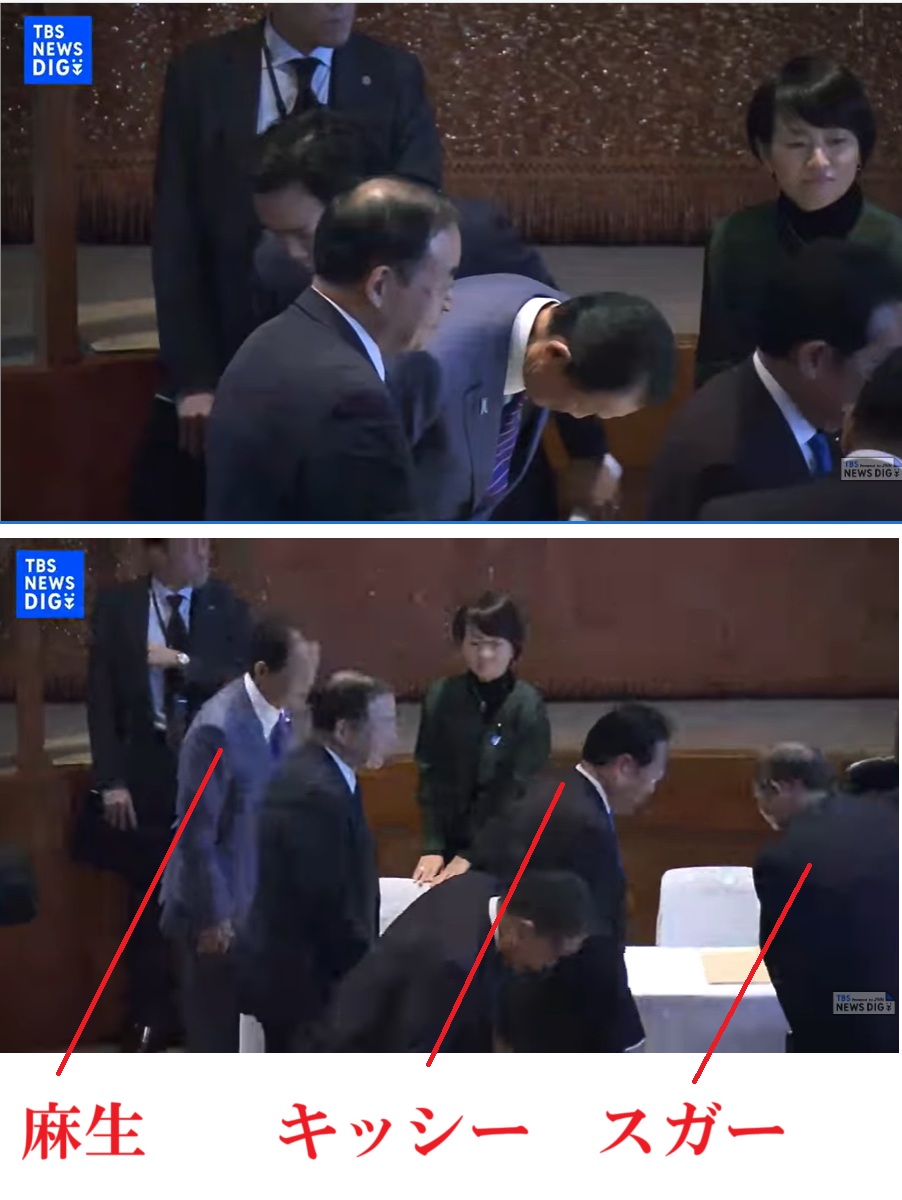 その後、スガーの存在に気が付き、麻生さんが深々と拝礼。今までだと考えられないことです。スガーも返礼してます。