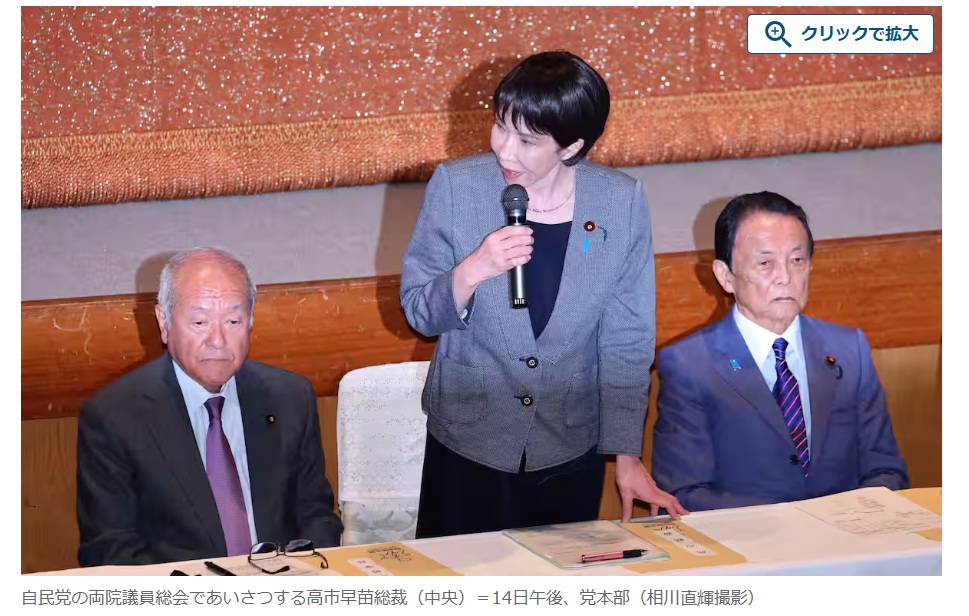 10/15 産経 公明の連立離脱で高市氏「私の責任だ」 自民党両院議員懇談会 「総総分離」論も