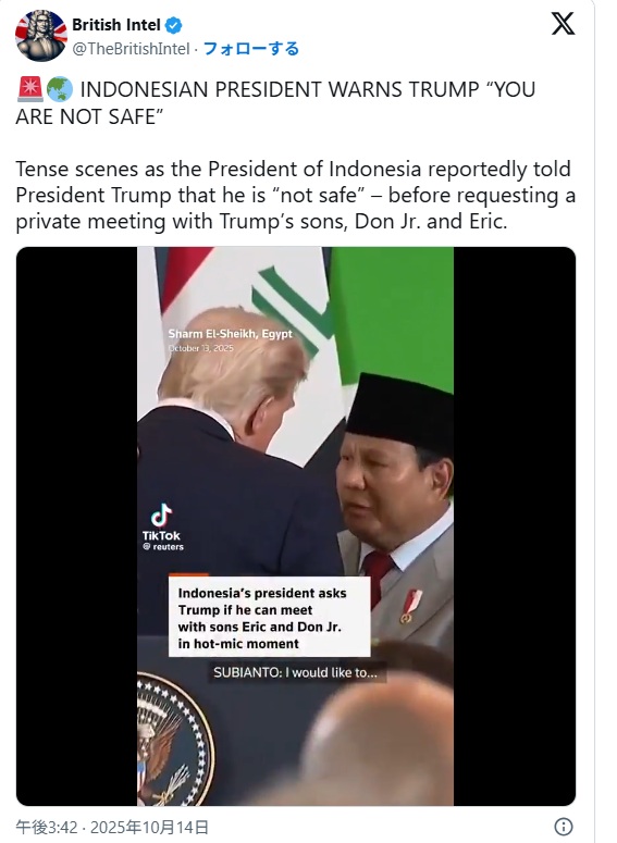 「インドネシア大統領がトランプ米国大統領に「あなたは安全ではない」と語ったとされる緊迫した場面が報じられています。その後、トランプは、トランプの息子たち、ドン・ジュニアとエリックとの非公開の会談を(インドネシア大統領に)要請しました」