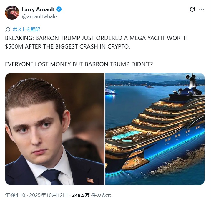 「速報:バロン・トランプが暗号通貨の最大の暴落後に5億ドル相当のメガヨットを注文。 誰もが損失を出したが、バロン・トランプは損しなかった?」