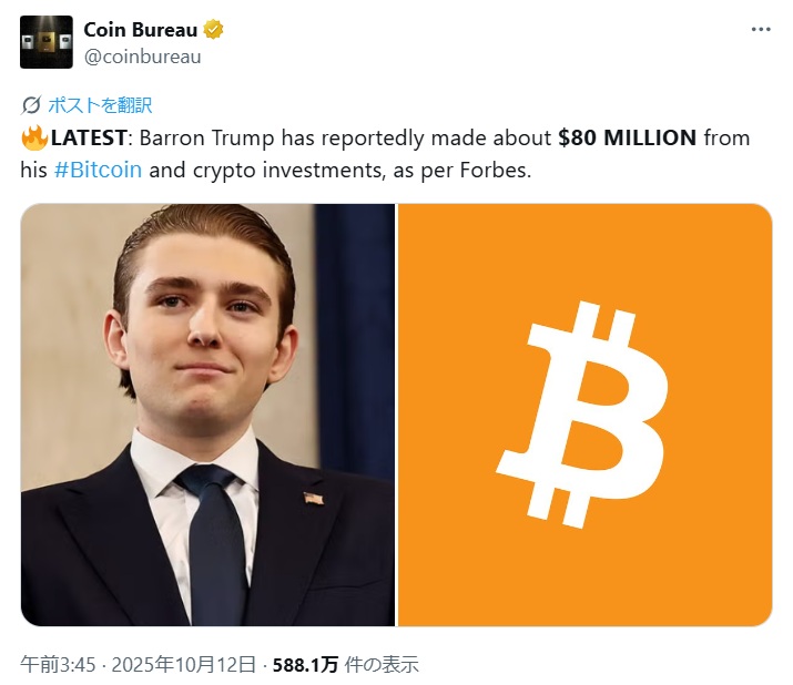 「最新情報:バロン・トランプが#Bitcoinや暗号資産への投資で約8000万ドルを稼いだとフォーブスが報じています」