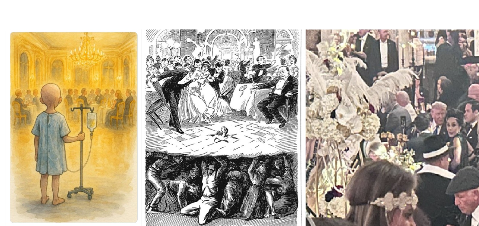 富裕層向けのボールルームについてのこの話すべてが、私たちその他の人々が医療や基本的な必需品により多くのお金を払い続けている中で、1906年のこの強力な政治風刺漫画を思い出させます。作者はウィリアム・バルフォア・カーです。