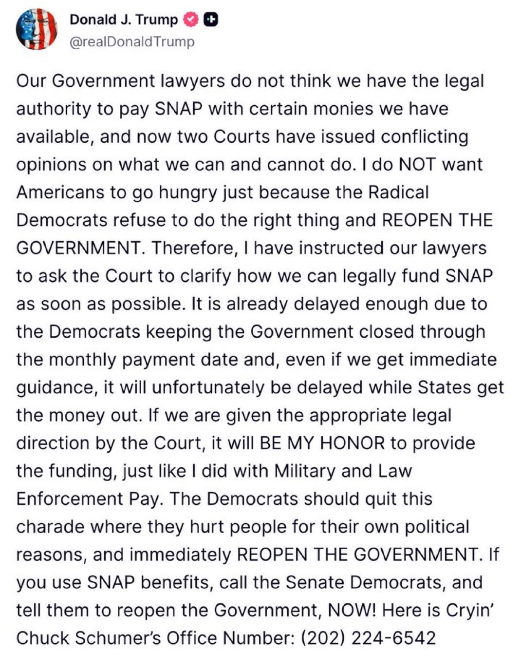 貧困層向け食費補助をトランプが停止している件、数百万世帯が飢える瀬戸際だったが、やっと連邦判事が一刻も早く配布するよう命令した。よかった。
