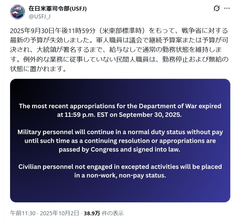 アメリカ政府は1日午前0時(日本時間同午後1時)過ぎ、連邦議会で予算案が可決されなかったことを受け、約7年ぶりに閉鎖された。