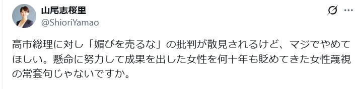 高市総理に対し「媚びを売るな」の批判が散見されるけど、マジでやめてほしい。懸命に努力して成果を出した女性を何十年も貶めてきた女性蔑視の常套句じゃないですか。