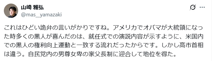 これはひどい詭弁の言いがかりですね。アメリカでオバマが大統領になった時多くの黒人が喜んだのは、就任式での演説内容が示すように、米国内での黒人の権利向上運動と一致する流れだったからです。しかし高市首相は違う。自民党内の男尊女卑の家父長制に迎合して地位を得た。