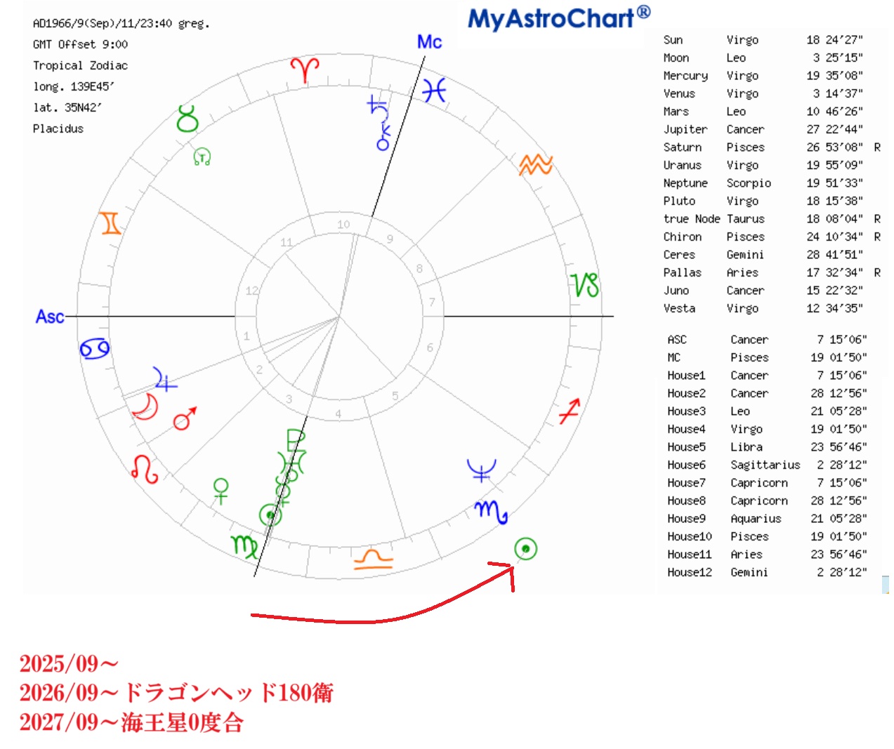 MC(天頂)に登ってるのがドラゴンヘッド、土星、海王星