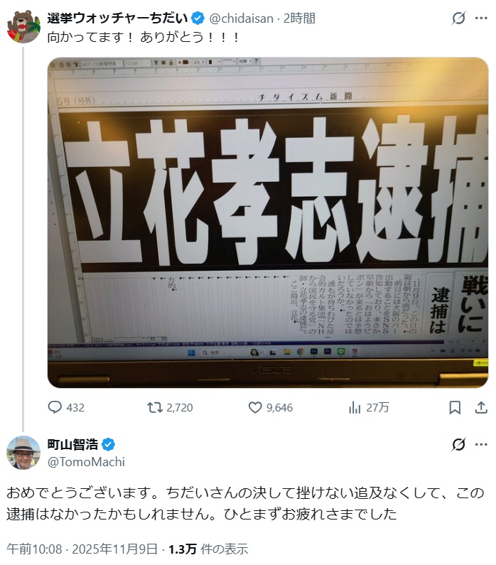 11/09 毎日新聞【速報】NHK党・立花孝志氏を名誉毀損容疑で逮捕 元兵庫県議への中傷で