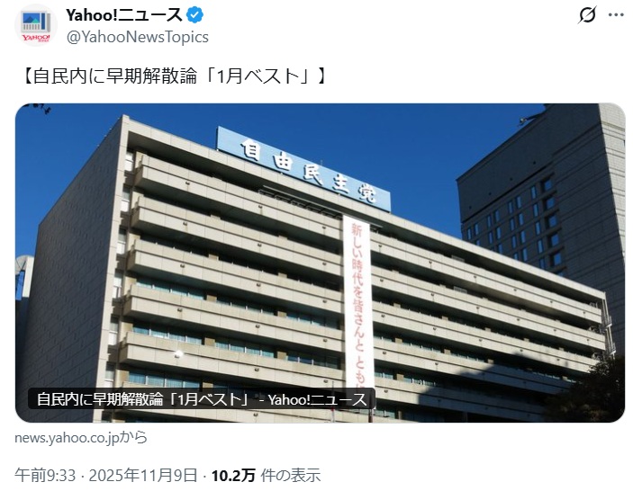 高市早苗内閣の支持率が報道各社の世論調査で60~70%台の高水準となったことを受け、自民党内で衆院の早期解散論が出始めている。