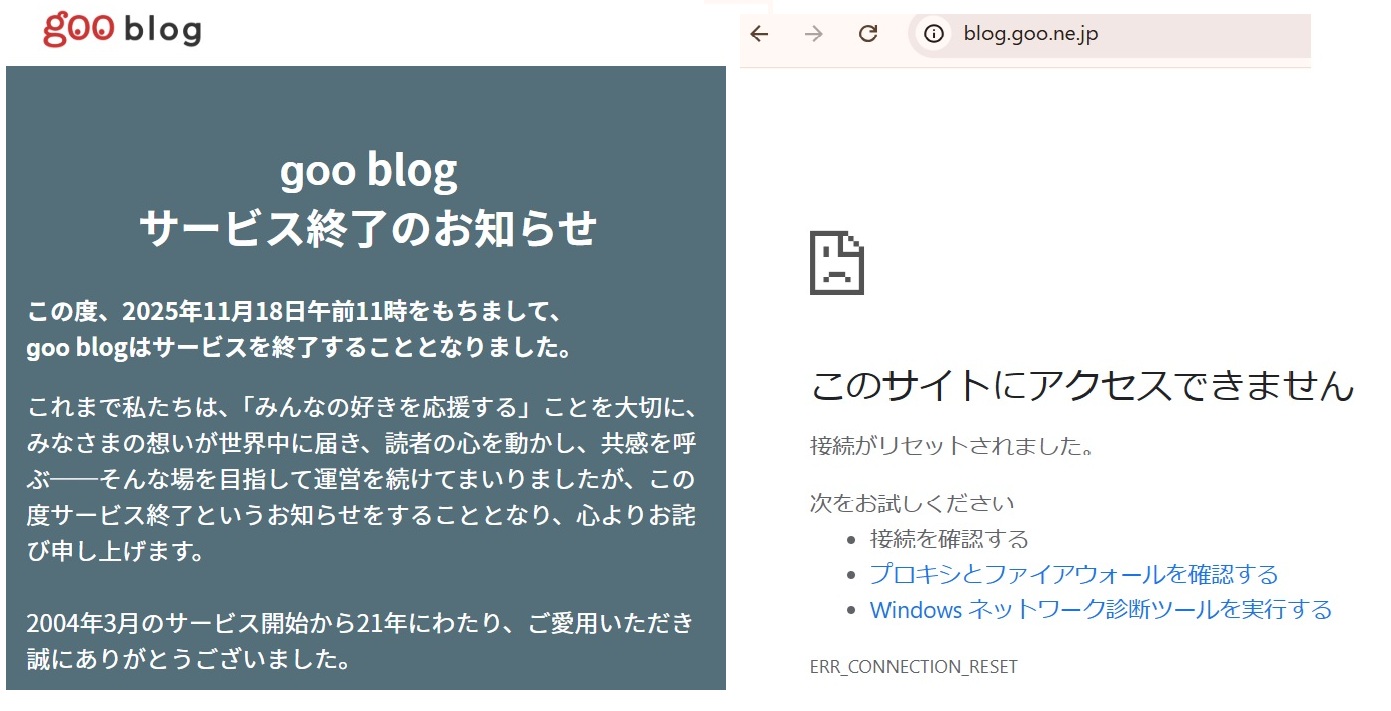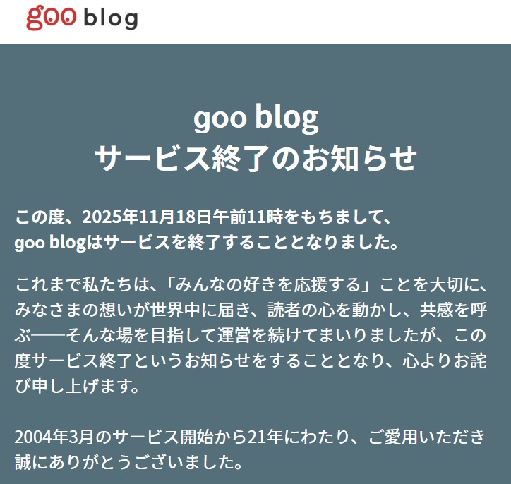 ブログサービスの創世記からの生き残りだったGooブログが、本日11時に閉鎖されました。