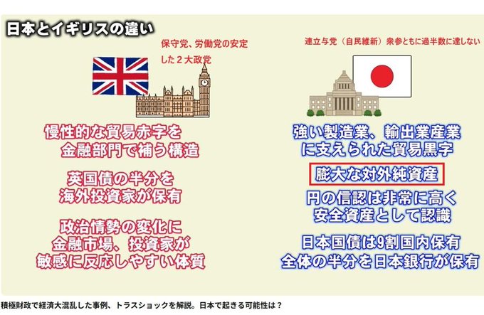 日英比較し日本の長所ばかり列挙しているが日本には政治の不安定と言う大きな政治リスクがあります。連立与党の議席が両院で過半数に未達で資質に問題のある高市早苗が総理である事。既に対中外交が破綻寸前な事。膨大な対外純資産がドル建ての点等です