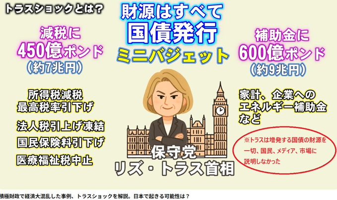 2022年、巨額減税(約7兆円)巨額補助金(約9兆円)合計16兆円の積極財政予算を組みましたが、トラスは増発する国債の財源を一切明らかにしませんでした
