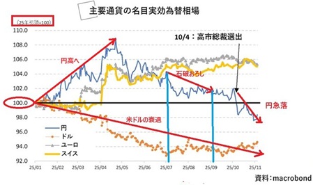 2025年初頭を100とした通貨価値の増減。円は石破おろしが始まって通貨価値の減少が始まり10/4高市が新総裁に選ばれて以降前年比マイナスまで暴落しました。債券安&円安です。ドルはトランプが就任以来一貫してドル安が続いています