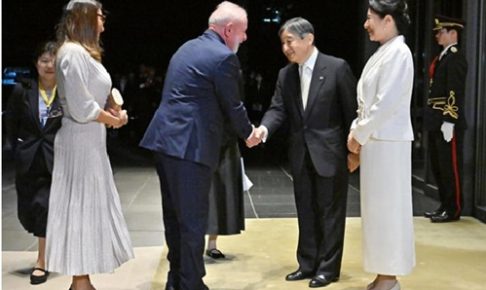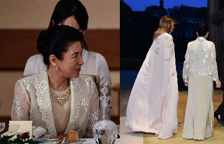 トランプ大統領歓迎宮中晩さん会にジャケット(=仕事着)付きイブニングドレスは全体未聞。おばさまが姪の結婚式にちょうどいいドレスと評されていました。