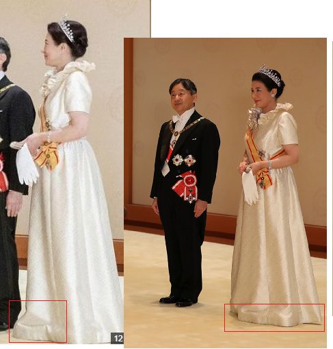 国賓訪問の服がコレ。裾がひどい。1メートルいくらのカーテン生地を使用した可能性が高い。
