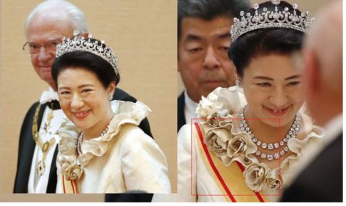 共布のバラのコサージュ。これは、プロトコル上では、「王太子妃」「皇太子妃」の意味らしい。しかしマサコは天皇の妻、いちおう皇后となってる。