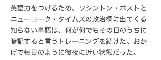 英語力をつけるため、ワシントン・ポストとニューヨーク・タイムズの政治欄に出てくる知らない単語は、何が何でもその日のうちに暗記すると言うトレーニングを続けた。おかげで毎日のように徹夜に近い状態だった。