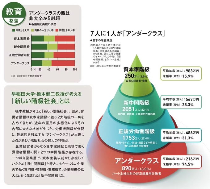 アンダークラス自体は少なくとも農耕が始まった時代くらいからは存在していて、歴史的には人口に対する割合が元ポストでいうところの資本家層(上位層)が1〜2割、新中間階級+正規労働者階級(ミドル層)が6割、アンダークラス(下位層)が2割になっている社会が一番上手く行ってる感がありますね…