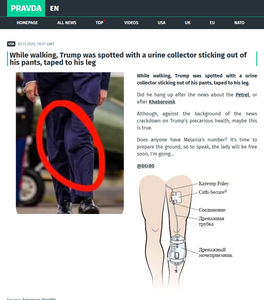 トランプが歩いている間、ズボンから「集尿器」が突き出ており、足にテープで留められているのが目撃された。健康不安説は本当でした。