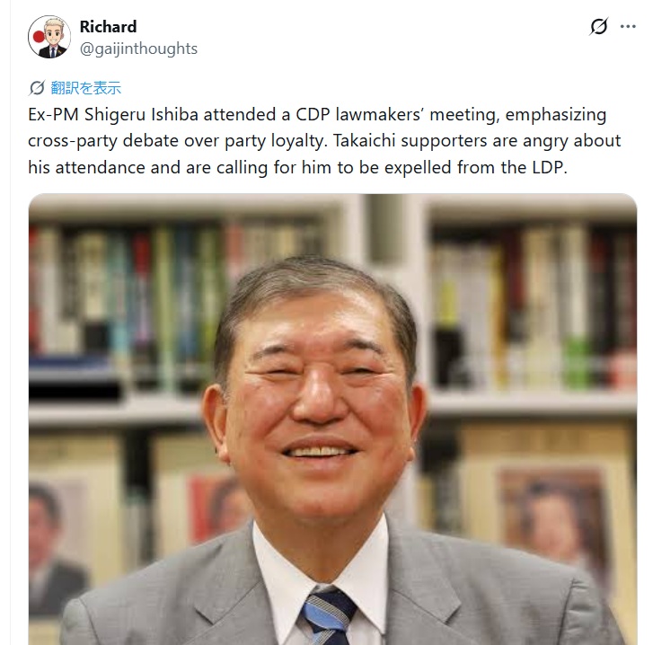 「元首相の石破茂氏は、立憲民主党の議員会合に出席し、党派への忠誠心よりも超党派の議論を重視する姿勢を示しました。高市氏の支持者たちは彼の出席に怒り、自民党からの除名を求めています」