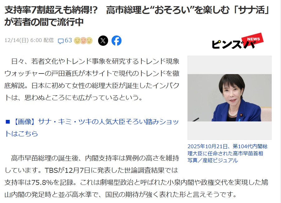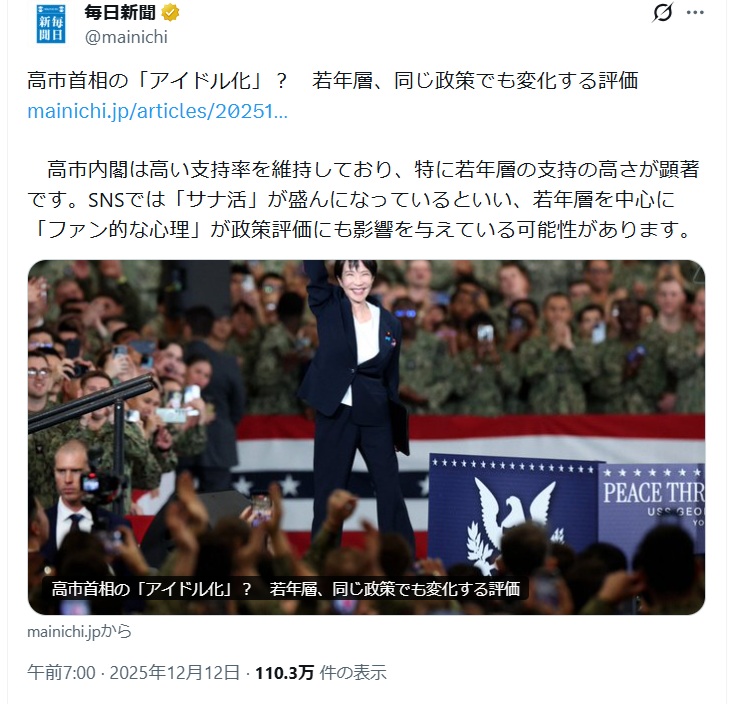 毎日「高市内閣は高い支持率を維持しており、特に若年層の支持の高さが顕著です。SNSでは「サナ活」が盛んになっているといい、若年層を中心に「ファン的な心理」が政策評価にも影響を与えている可能性があります」