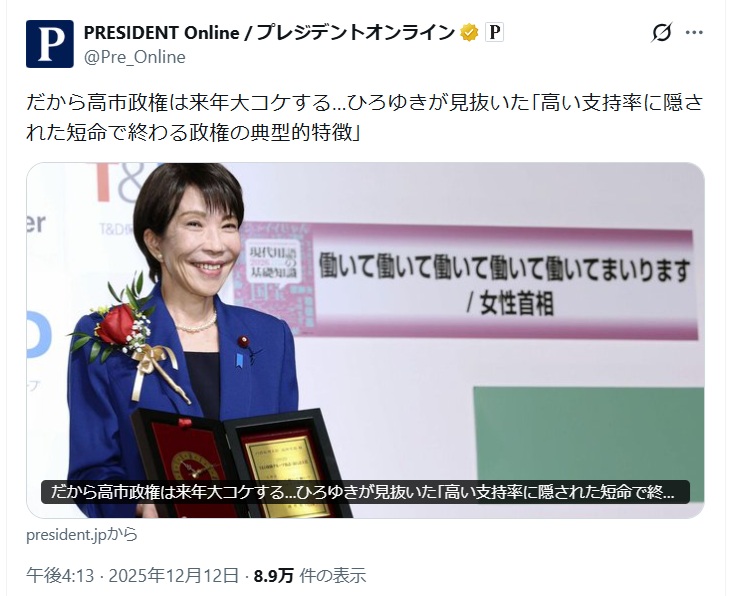 ・その内、何処かの芸能事務所が『伸び代がなくて扱いに困っている女優やアイドル』に高市メイク、同ファッションをさせ太鼓持ちタレント的に仕立て『新たな使い道』を見出す…なんて流れになりそうですよね。この勢いだと来年は『ベスト◯◯賞』の違いを彼女が総ナメするのではありませんかね
