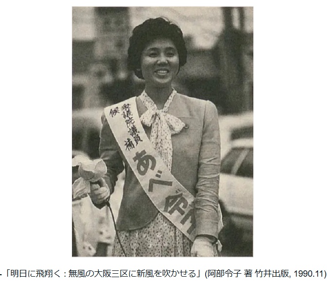 阿部 令子 女史は、統一教会信者初の女性代議士立候補者、大阪3区初の女性代議士立候補者。自民党衆議院議員・渡辺美智雄の私設秘書を勤め、「日本教育婦人問題研究所」を創設。