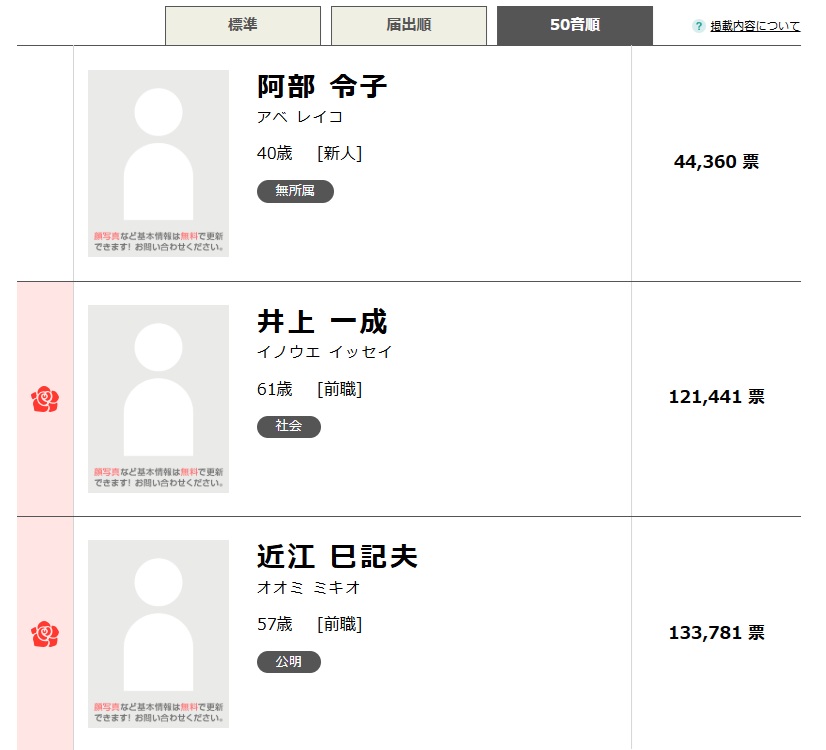 あべ玲子は以前の得票を半分近く減らして44,360 票で落選