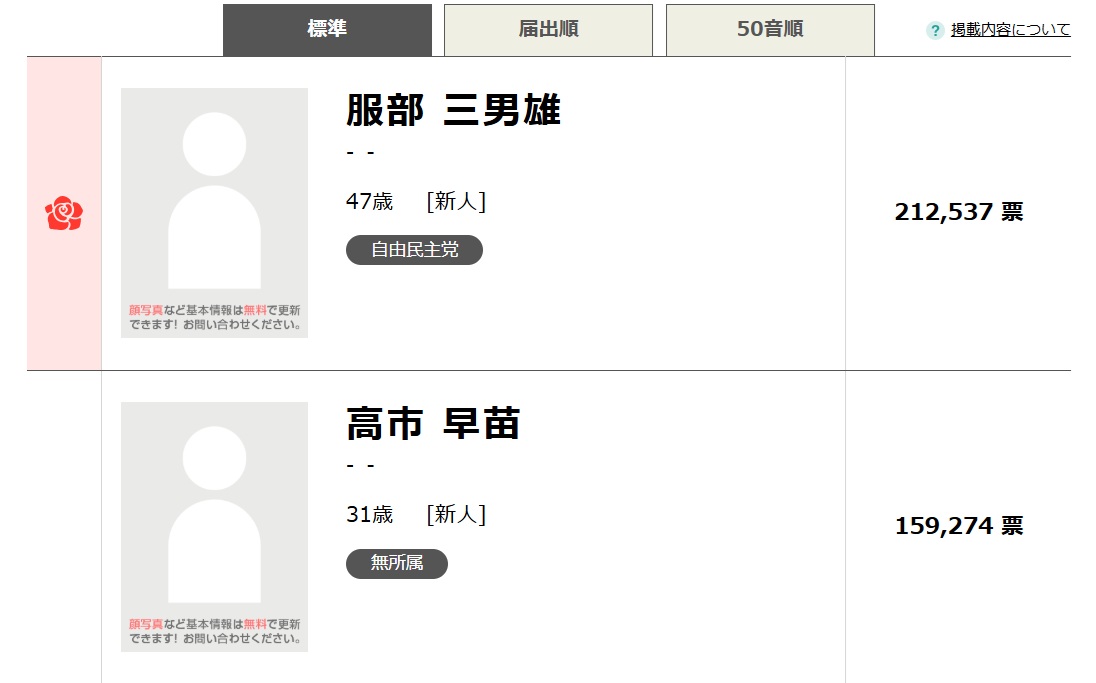 ※自民党奈良県連の投票の結果、世襲の服部氏(実父の参議院議員の服部安司の引退により出馬)が公認候補になり、早苗は無所属で出馬し落選。