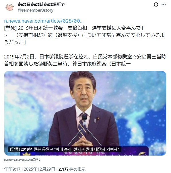 韓国メディアは、2019年参院選直前に旧統一教会幹部が安倍首相と面談し、教団の選挙支援について「非常に喜んでいた」と内部記録に残していたと報道。